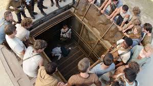 The 21 remaining Gladers descend down a spiraling slide that dumps them into a massive underground bunker. There they meet the Creators: thin, pale, joyless adults who take copious notes while observing them from behind glass. A woman greets the Gladers, telling them they have done well. Gally appears and throws a knife at Thomas. Chuck dives in front of it, sacrificing his life to save him. Enraged, Thomas attacks Gally and knocks him unconscious.